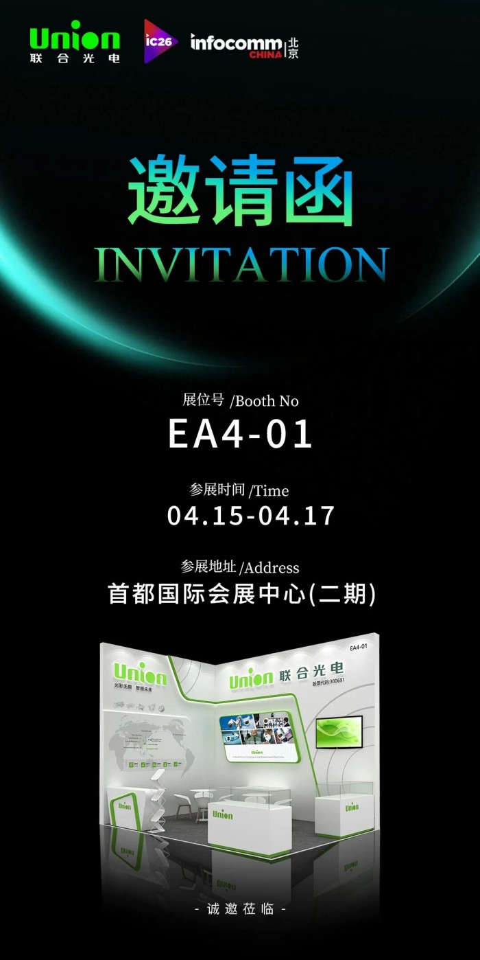 技术不止于参数,更在于真实场景中的稳定表现与持续价值。联合光电始终坚持以光学为核心,以创新为驱动,为全球客户提供从设计、研发到量产的一站式光学解决方案。2026北京InfoComm,我们将在EA4-01期待您的到来,期待与您共绘清晰、智能、沉浸的光学未来!
