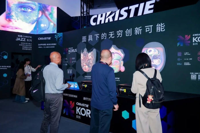 本次展会最受期待的亮点之一,是科视全新Korus系列投影机的中国首秀。Korus 4K1400‑KS 1DLP搭载0.8英寸HEP DMD芯片与4K UHD+超高清分辨率,具备14250流明亮度输出,画面细腻度、对比度与动态表现达到行业一流水平。现场,Korus系列以面具投影映射创意形式,点亮印度、威尼斯、中国戏曲雕塑面具,将艺术与科技完美融合,展现其在小型创意投影、艺术装置、舞台特效等场景的强大表现力。