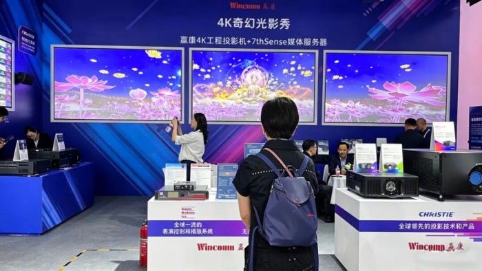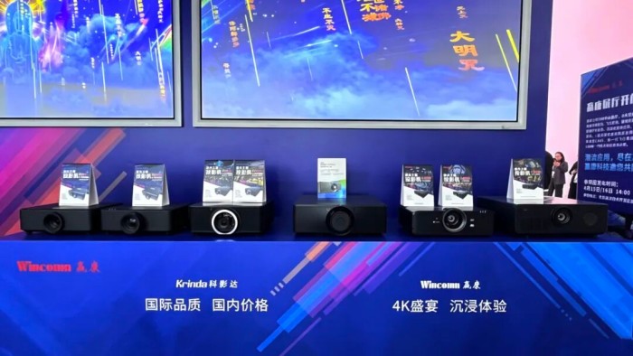 本次展出,赢康自主国产品牌投影机悉数登场。包括科影达Krinda C-WU700L,科影达Krinda C-WU800L,科影达Krinda C-WU1200L,科影达Krinda C-WU1500L,科影达Krinda C-WU2000L,赢康C-4K650,赢康C-4K900,以及投影秀中投入使用的赢康C-4K1200。均采用了激光光源,流明亮度覆盖7000~20000流明,具有包括4K在内的多种分辨率。