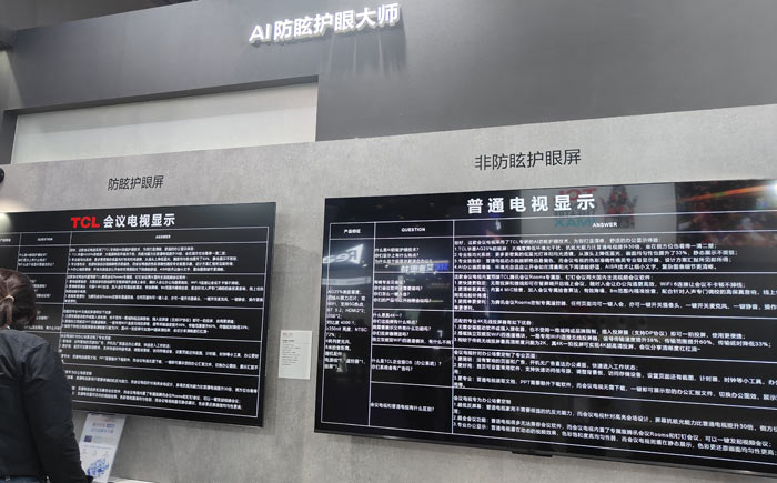 作为会议电视行业标准唯一牵头单位,TCL 商显现场带来会议电视与普通显示设备三大硬核对比测试 ——防眩光对比、显示均匀性对比、AI 办公画质优化,直观展现专业会议显示的技术优势。核心产品搭载AI 防眩护眼技术,有效解决强光环境下可视性差、视觉疲劳等痛点;搭配 AI 音视频算法、智慧白板 2.0 及全场景 AI 会议助手,实现多端无缝协同、大小屏联动演示,全面适配中大型会议场景,助力企业会议效率跨越式提升。