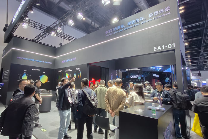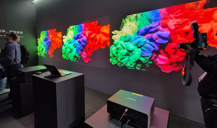 现场,海信激光商用投影玄彩系列实机演示,投射出来的画面细腻逼真,色彩卓越,吸引了诸多专业人士和行业媒体的驻足体验。值得一提的是,海信激光三色商用投影新品在行业内首次采用相位调制散斑抑制方案,使散斑大幅降低,基本达到人眼不感知的效果。