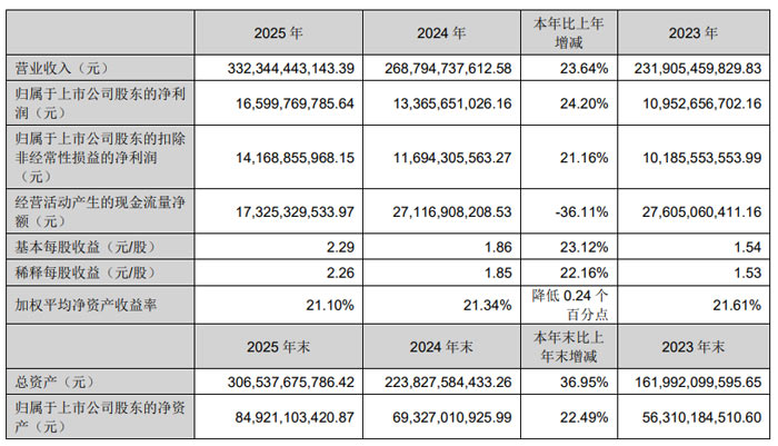 2025 年,立讯精密实现营业收入 3323.44 亿元,同比增长 23.64%;归属于上市公司股东的净利润166.00 亿元,同比增长 24.20%;扣除非经常性损益后的净利润141.69 亿元,同比增长 21.16%。基本每股收益 2.29 元,加权平均净资产收益率 21.10%。