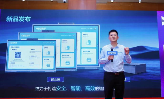 宇视科技显控及会议事业部产品总工戴鑫受邀出席,并发表题为《AI时代,重新定义会议》的主题演讲,正式发布宇视科技智会屏与智会盒两款端侧AI会议新品。