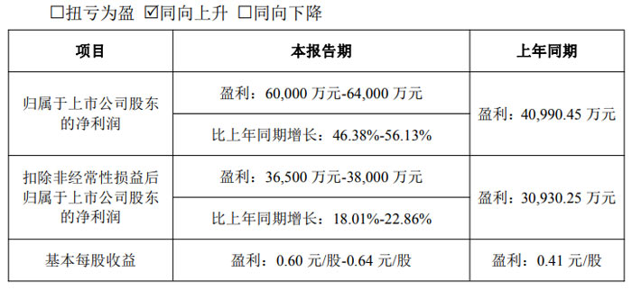 根据业绩预告,华工科技 2026 年第一季度预计实现归属于上市公司股东的净利润6.00 亿元至 6.40 亿元,上年同期为4.10 亿元,同比增长46.38% 至 56.13%;预计扣除非经常性损益后归属于上市公司股东的净利润3.65 亿元至 3.80 亿元,上年同期为3.09 亿元,同比增长18.01% 至 22.86%。基本每股收益预计为0.60 元 / 股至 0.64 元 / 股,上年同期为0.41 元 / 股。