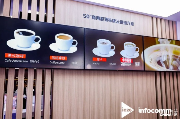 飞利浦则围绕咖啡店等场景打造高品质场景体验。展出的50英寸商用超薄标牌、高对比度防眩光的吧台屏,以及支持横竖屏自由切换、4K长时间流畅运行的86寸商用房价牌都让人眼前一亮。