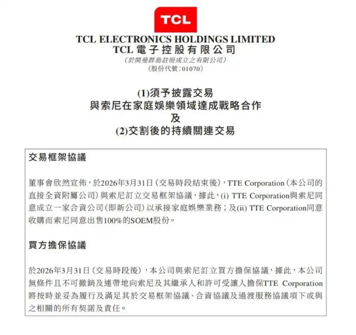 3月31日,TCL电子发布公告,其全资子公司TTE Corporation与索尼达成交易框架:双方成立合资公司承接索尼全球家庭娱乐业务,TCL持股51%实现控股,索尼保留49%股权;同时TCL全资收购索尼马来西亚制造子公司SOEM 100%股权,交易总对价753.99亿日元(约37.81亿港元),预计2027年4月完成交割。这是近二十年来全球电视行业最具标志性的并购案,意味着中国企业首次掌控日系高端电视品牌的运营主导权。