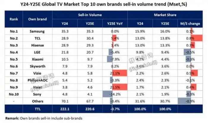 行业分析普遍认为,此次并购将重塑全球彩电格局。当前全球电视市场呈现“三星、TCL、海信”三强争霸,2025年三者出货量市占率分别为16%、13.8%、13.3%。TCL控股索尼后,若整合顺利,两者合计市占率将突破16%,直逼三星,尤其在欧洲、日本等高端市场,TCL与索尼组合将形成强大竞争力。行业内人士指出,这标志着中国彩电企业从“制造输出”迈向“品牌+技术输出”,彻底改变过去“低价走量”的行业形象。