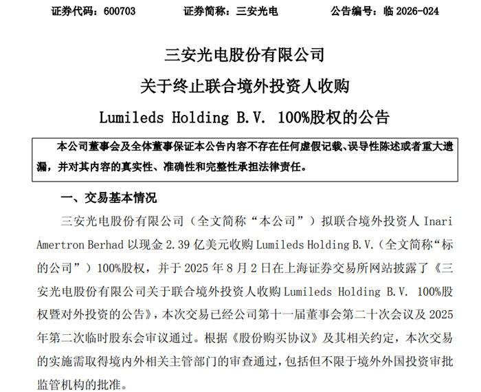 三安光电股份有限公司(证券代码:600703,证券简称:三安光电)于 2026 年 4 月 18 日发布公告(公告编号:临 2026-024),宣布终止联合境外投资人收购 Lumileds Holding B.V. 100% 股权事项。