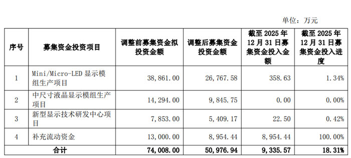 中尺寸液晶显示模组生产项目:调整后投资金额 0.98 亿元,已投入 0.00 万元,投入进度 0.00%