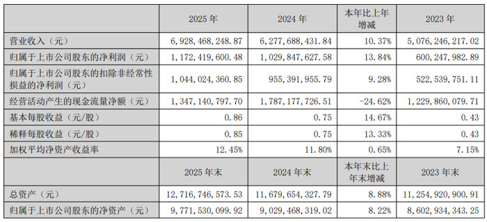 2025 年,公司整体经营保持高质量发展,核心财务指标全面向好。截至报告期末,公司总资产达127.17 亿元,较上年末增长8.88%;归属于上市公司股东的净资产97.72 亿元,较上年末增长8.22%。