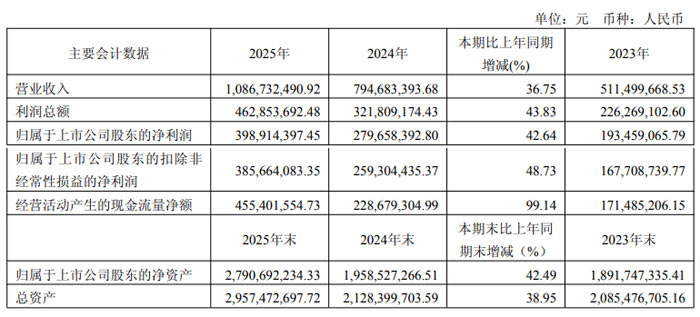 截至 2025 年末,公司总资产达29.57 亿元,同比增长 38.95%;归属于上市公司股东的净资产27.91 亿元,同比增长 42.49%,整体资产规模与净资产实力稳步增强。基本每股收益 1.49 元 / 股,同比增长 39.25%;加权平均净资产收益率 17.52%,较上年增加 3.22 个百分点,股东回报能力持续提升。