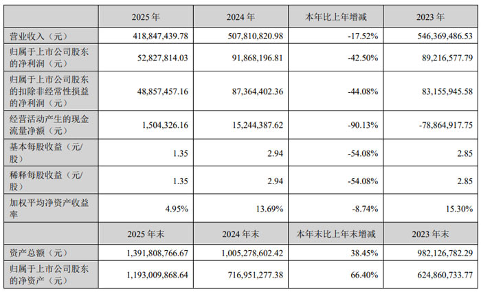 2025 年,公司实现营业收入 4.19 亿元,同比下降 17.52%;归属于上市公司股东的净利润5282.78 万元,同比下降 42.50%;扣除非经常性损益后的净利润4885.75 万元,同比下降 44.08%。经营活动产生的现金流量净额150.43 万元,同比下降 90.13%。