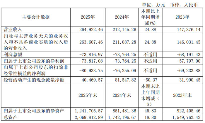 报告期内,公司实现产量859.02 万片,同比增长33.55%;销量807.37 万片,同比增长29.08%;全年营业收入达26.49 亿元,较上年同期增长24.88%。受新工厂产能爬坡、固定资产折旧摊薄尚未充分、高强度研发投入及市场传导滞后等因素影响,公司归属于母公司股东的净利润为 **-7.38 亿元 **,与上年基本持平;扣除非经常性损益后净利润为 **-8.09 亿元 **,截至期末未弥补亏损26.66 亿元。