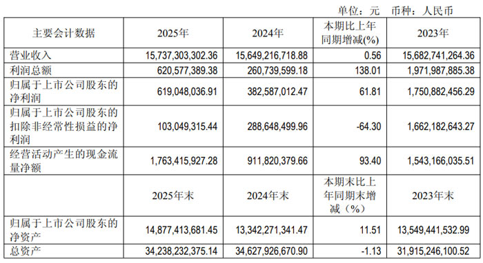 2025 年,旗滨集团实现营业收入 157.37 亿元,同比增长 0.56%;实现利润总额 6.21 亿元,同比增长 138.01%;归属于上市公司股东的净利润 6.19 亿元,同比增长 61.81%;经营活动产生的现金流量净额 17.63 亿元,同比大幅增长 93.40%。