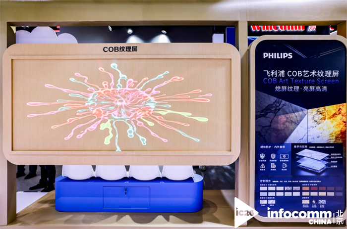 现场,飞利浦商显还推出基于COB封装技术的二代高亮纹理屏新品,该产品采用表面处理工艺设计,熄屏时可呈现木纹、大理石纹、金属等墙面装饰效果,支持定制化显示方案,实现视觉与环境的深度融合,增强环境的艺术感和科技感,广泛适用于家居装饰、展览展示、商业空间等场景及科技场馆。