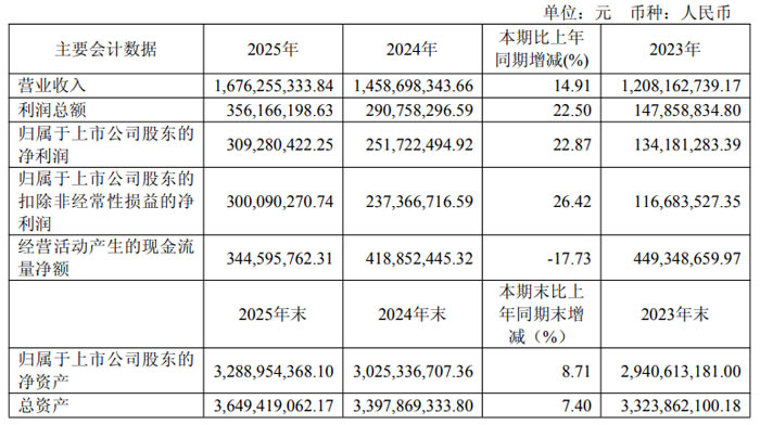 回报股东方面,公司发布 2025 年度利润分配预案,拟以总股本 1.74 亿股为基数,向全体股东每 10 股派发现金红利 9.00 元(含税),合计派发现金红利 1.56 亿元,现金分红金额占合并报表归母净利润比例达 50.59%。