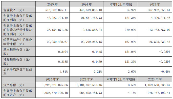 财务数据显示,2025 年英诺激光实现营业收入5.13 亿元,同比增长14.92%;归属于上市公司股东的净利润4832.37 万元,同比大幅增长121.35%;扣除非经常性损益后的净利润3615.49 万元,同比增长279.92%,盈利能力显著增强。经营活动产生的现金流量净额2025.94 万元,同比实现由负转正,增长167.99%,现金流状况持续改善。