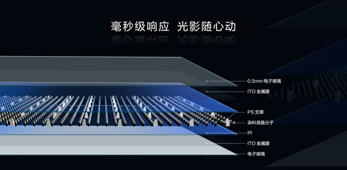 京东方光幕技术通过电压精准控制液晶分子偏转,实现0.16秒的毫秒级极速调光与隐私通透间的无缝切换,响应速度远超传统方案。