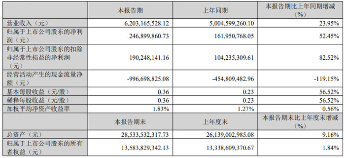 从财务数据变动原因来看,货币资金、少数股东权益、资本公积较年初大幅波动,主要因报告期内大族数控在香港联交所主板上市发行新股募集资金;营业收入、营业成本、各项费用及利润指标同比大幅增长,得益于企业主营业务大幅增长;应收款项融资增加源于票据结算增多,在建工程增长则因华东区域总部基地等项目投入增加,同时企业报告期内归还较多金融机构借款,短期借款、长期借款等负债指标有所下降。