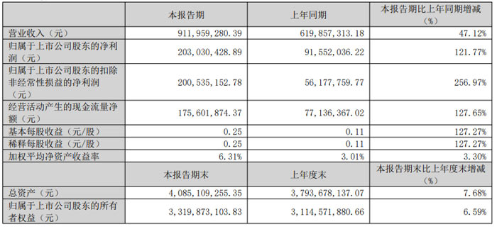 2026 年第一季度,全志科技实现营业收入 9.12 亿元,较上年同期的 6.20 亿元同比增长 47.12%;归属于上市公司股东的净利润为 2.03 亿元,同比增长 121.77%;归属于上市公司股东的扣除非经常性损益的净利润达 2.01 亿元,同比大幅增长 256.97%。经营活动产生的现金流量净额为 1.76 亿元,同比增长 127.65%;基本每股收益 0.25 元 / 股,同比增长 127.27%;加权平均净资产收益率 6.31%,较上年同期提升 3.30 个百分点。