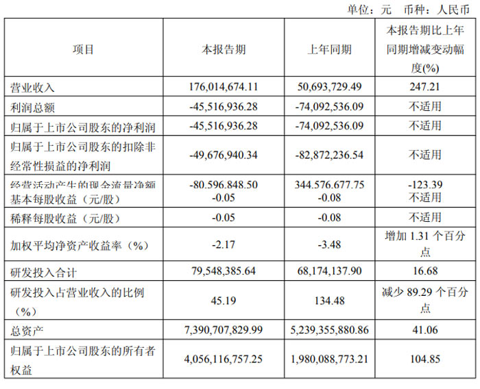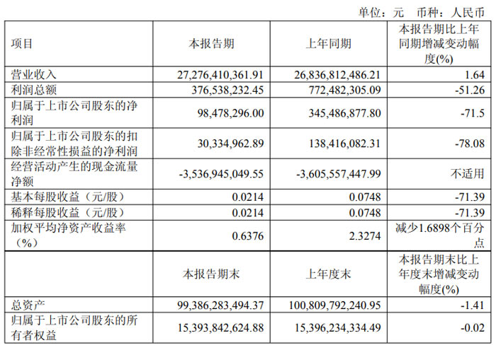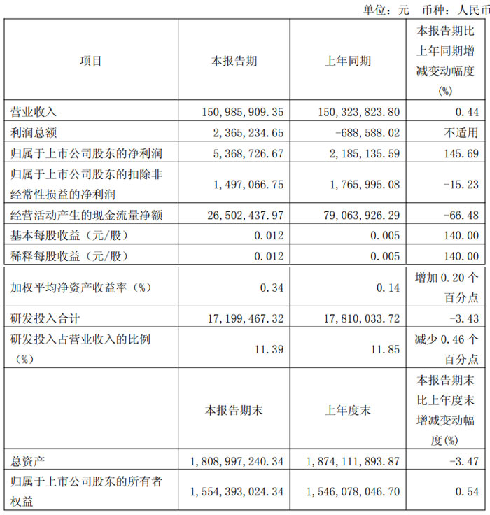 经营活动产生的现金流量净额为 -8329.30 万元 ,较上年同期的 -20011.22 万元同比改善 58.38%。基本每股收益与稀释每股收益均为-0.16 元 / 股 ,上年同期均为 0.01 元 / 股;加权平均净资产收益率为 - 1.13%,较上年同期的 0.17% 下降 1.30 个百分点。