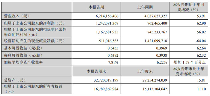 2026 年第一季度,沪电股份实现营业收入62.14 亿元,较上年同期的 40.38 亿元增长 53.91%;归属于上市公司股东的净利润12.42 亿元,同比增长 62.90%;归属于上市公司股东的扣除非经常性损益的净利润11.63 亿元,同比增长 56.02%。