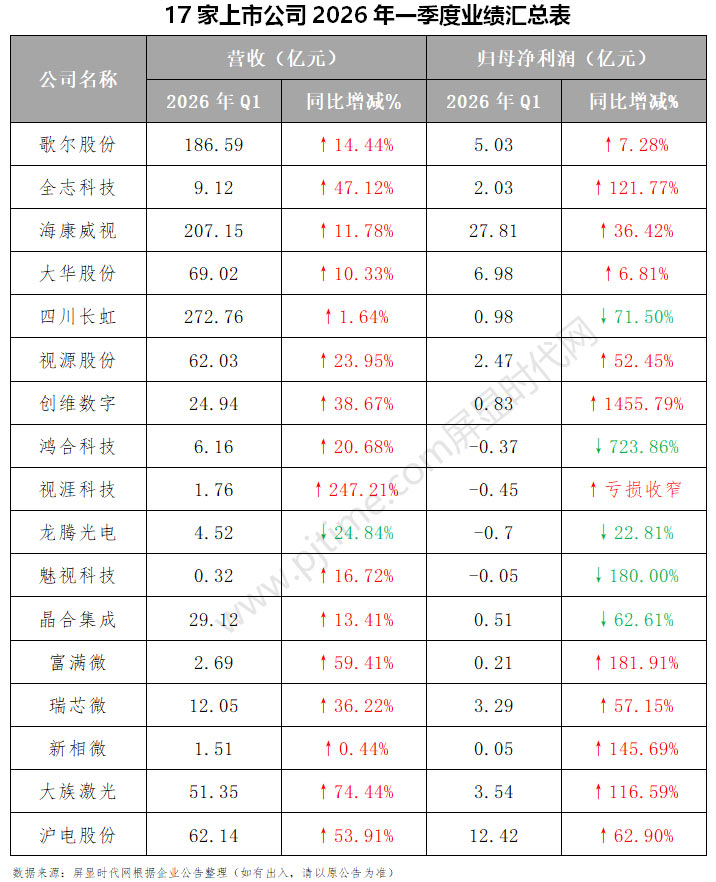近日,歌尔股份、全志科技、海康威视、大华股份、四川长虹、视源股份、创维数字、鸿合科技、视涯科技、龙腾光电、魅视科技、晶合集成、富满微、瑞芯微、新相微、大族激光、沪电股份17家上市公司披露2026年第一季度财报,业务涵盖LED、电视、投影、AI眼镜、车载显示、大屏商显等领域。