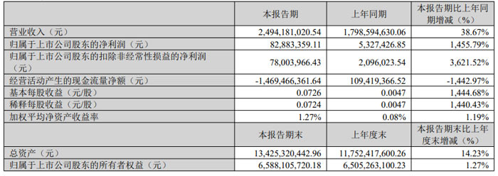 现金流方面,本报告期经营活动产生的现金流量净额为 - 14.69 亿元,同比下降 1442.97%,主要因战略储备原材料支付采购款增加;投资活动产生的现金流量净额为 - 0.55 亿元,同比减亏 41.98%;筹资活动产生的现金流量净额为 13.93 亿元,同比增长 1455.46%,主要系银行借款筹资净现金流增加。