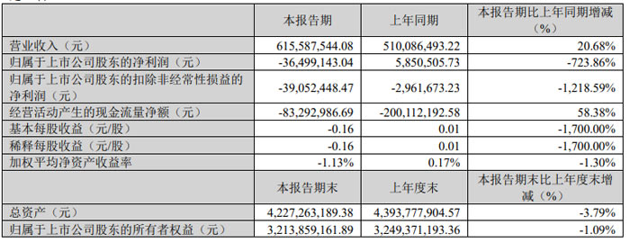 经营活动产生的现金流量净额为 -8329.30 万元 ,较上年同期的 -20011.22 万元同比改善 58.38%。基本每股收益与稀释每股收益均为-0.16 元 / 股 ,上年同期均为 0.01 元 / 股;加权平均净资产收益率为 - 1.13%,较上年同期的 0.17% 下降 1.30 个百分点。