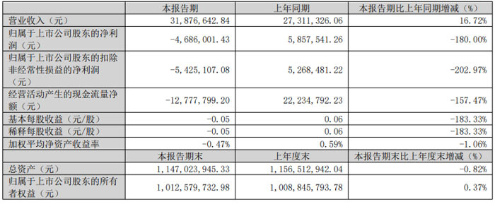 经营活动产生的现金流量净额为 - 1277.78 万元,上年同期为 2223.48 万元,同比下降 157.47%;加权平均净资产收益率为 - 0.47%,较上年同期的 0.59% 下降 1.06 个百分点。