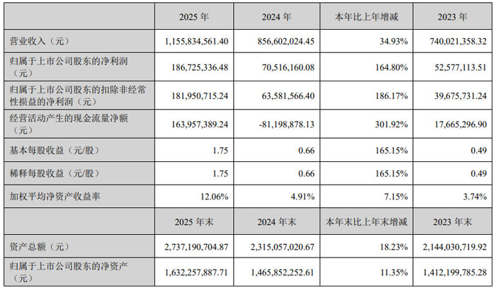 2025 年,凯格精机实现营业收入11.56 亿元,同比增长 34.93%;归属于上市公司股东的净利润1.87 亿元,同比增长 164.80%;扣除非经常性损益后的净利润1.82 亿元,同比增长 186.17%。基本每股收益 1.75 元,同比增长 165.15%,加权平均净资产收益率 12.06%,同比提升 7.15 个百分点。
