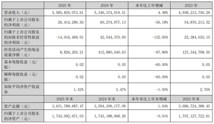 报告期内,英唐智控实现营业收入 55.86 亿元,较上年同期增长 4.48%;归属于上市公司股东的净利润为 0.26 亿元,较上年同期下降 56.18%;归属于上市公司股东的扣除非经常性损益的净利润为 - 0.14 亿元,较上年同期下降 132.95%。经营活动产生的现金流量净额为 0.09 亿元,同比下降 97.86%。业绩变动主要受电子元器件分销业务毛利率下滑、芯片业务研发投入大幅增加,以及英唐微技术未完成业绩对赌等因素综合影响。