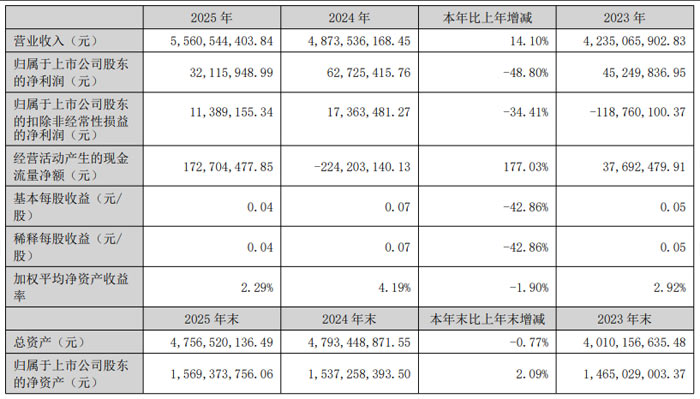 2025 年,万润科技实现营业收入55.61 亿元,同比增长 14.10%;归属于上市公司股东的净利润3211.59 万元,同比下降 48.80%;归属于上市公司股东的扣除非经常性损益的净利润1138.92 万元,同比下降 34.41%。