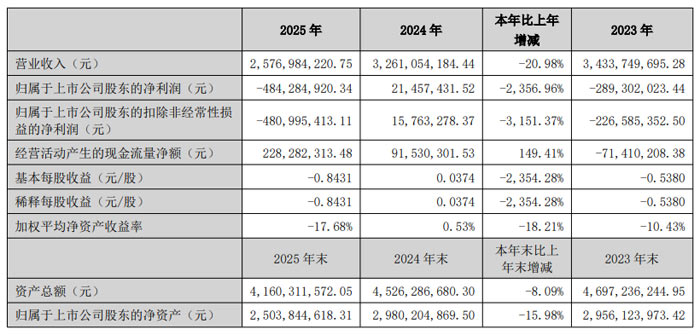 报告显示,2025 年经纬辉开实现营业收入 25.77 亿元,同比下降 20.98%;归属于上市公司股东的净利润为 - 4.84 亿元,同比下降 2356.96%;扣除非经常性损益后的净利润为 - 4.81 亿元,同比下降 3151.37%。经营活动产生的现金流量净额为 2.28 亿元,同比增长 149.41%。截至 2025 年末,经纬辉开资产总额 41.60 亿元,同比下降 8.09%;归属于上市公司股东的净资产 25.04 亿元,同比下降 15.98%。