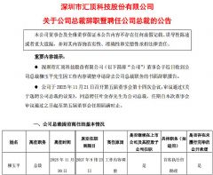 2025 年 11 月 22 日,深圳市汇顶科技股份有限公司(证券代码:603160,证券简称:汇顶科技)发布公告,宣布公司总裁人事调整事宜:原总裁柳玉平先生因工作内容调整申请辞职,公司董事会审议通过聘任叶金春先生为新任总裁,确保公司经营管理工作平稳衔接。…详情>>